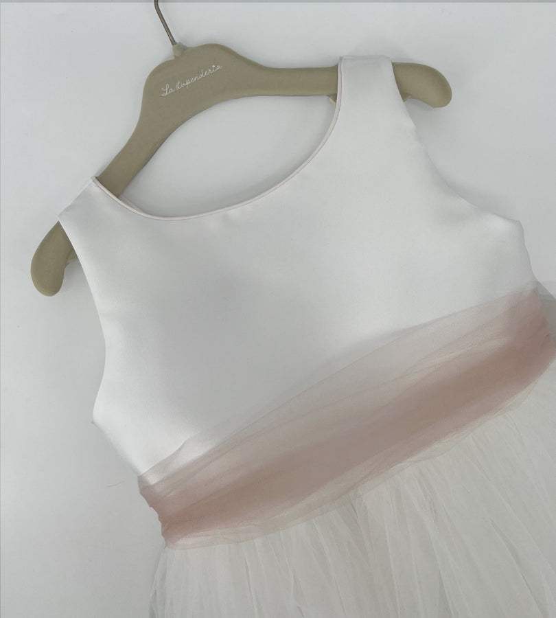 Long dress with silk mikado bodice and skirt entirely covered in white tulle with handmade pink silk flowers, long pink tulle belt and pure cotton lining